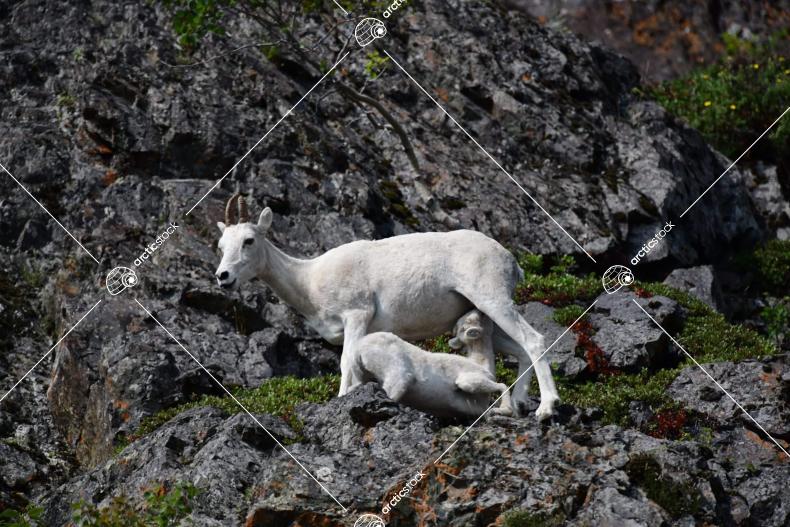 Dall sheep ewe feeds her young in the Brooks range of Alaska