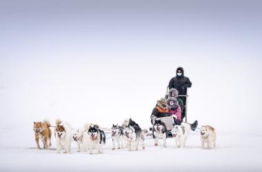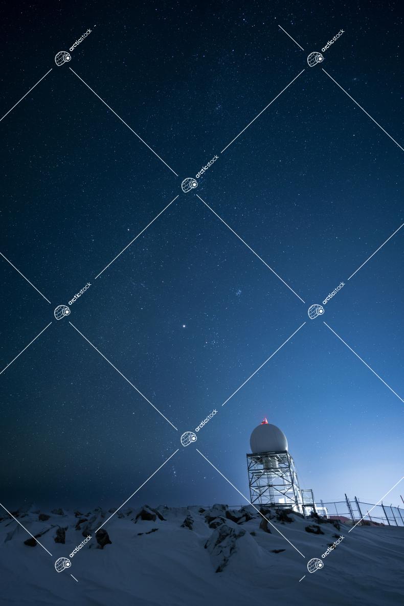 A giant ball shaped satellite/antennae fixture sits below the arctic sky, enveloped by the white glow of Iqaluit's light pollution in the background.