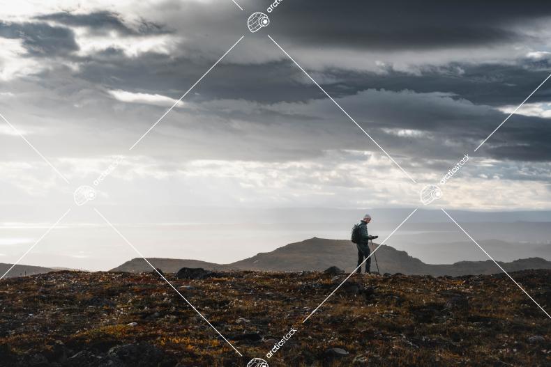 A hiker walks across the top of a hill in Road to Nowhere as dramatic weather rolls into Iqaluit in the background.