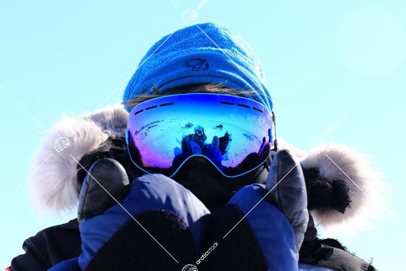 A great day of dog sledding reflected in snow goggles.