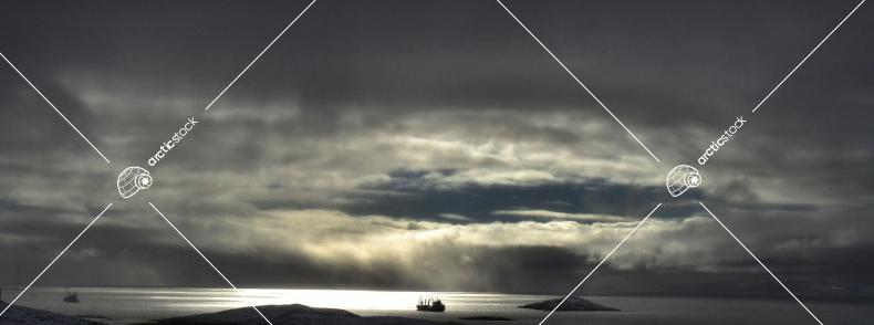 A late season shipping vessel in Frobisher Bay is captured under some ominous skies .