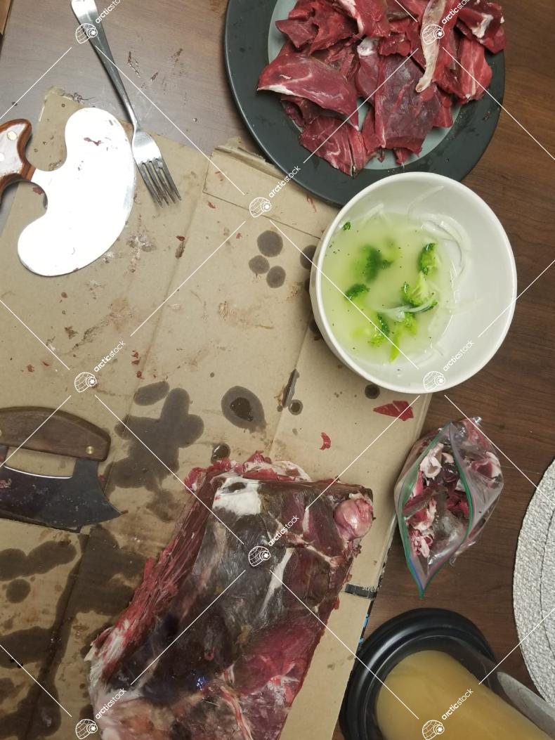 Frozen caribou meat, quaq, served for dinner, with broccoli, onion and vegetable oil.