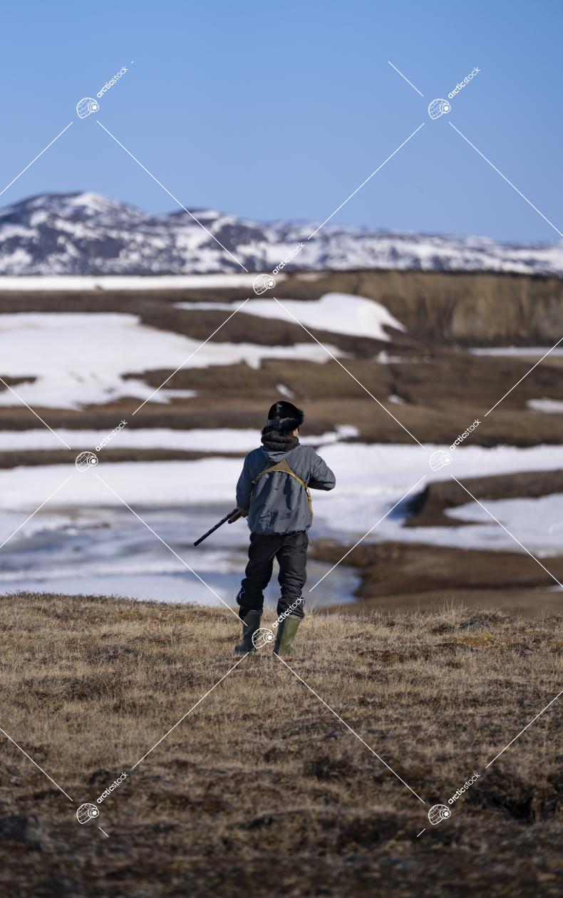 Hunter takes a walk on the freshly thawed arctic tundra during a spring goose hunt.