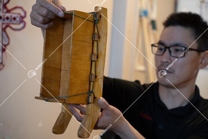 Inuit Man Holding Wooden Sled