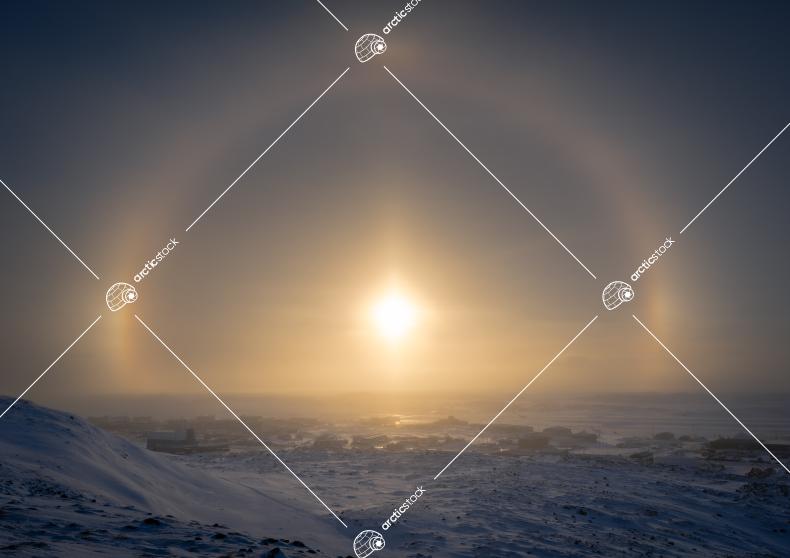 Sundog creates giant golden dome over Iqaluit as the arctic sun sets in the mid afternoon.