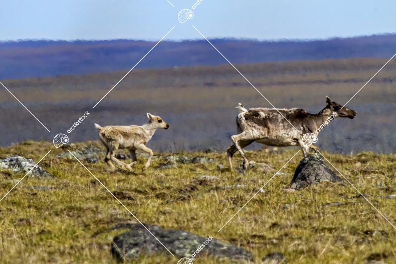 Caribou survey goes well on Baffin island. A mother and her young one are running downwind in the toundra to smell who we are...
