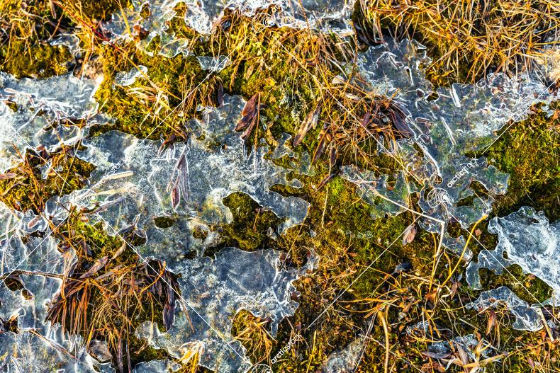Small pieces of ice create formations resembling a map in the green arctic moss.