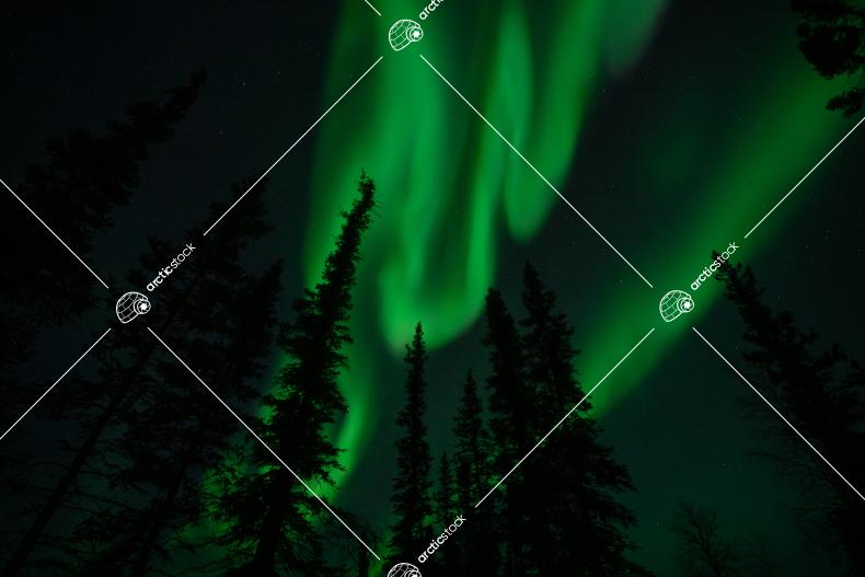 Aurora borealis overhead, seen through the trees outside of Yellowknife