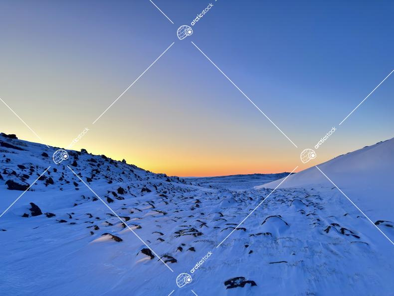 Golden sunset bathes a vast Arctic valley in fiery orange, casting long shadows over snow-dusted rocks and endless flat white expanses under a twilight-blue sky.