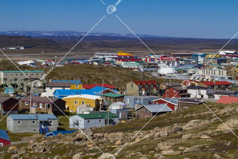 View of Iqaluit highlighting Anglican Church and yellow Iqaluit airport terminal