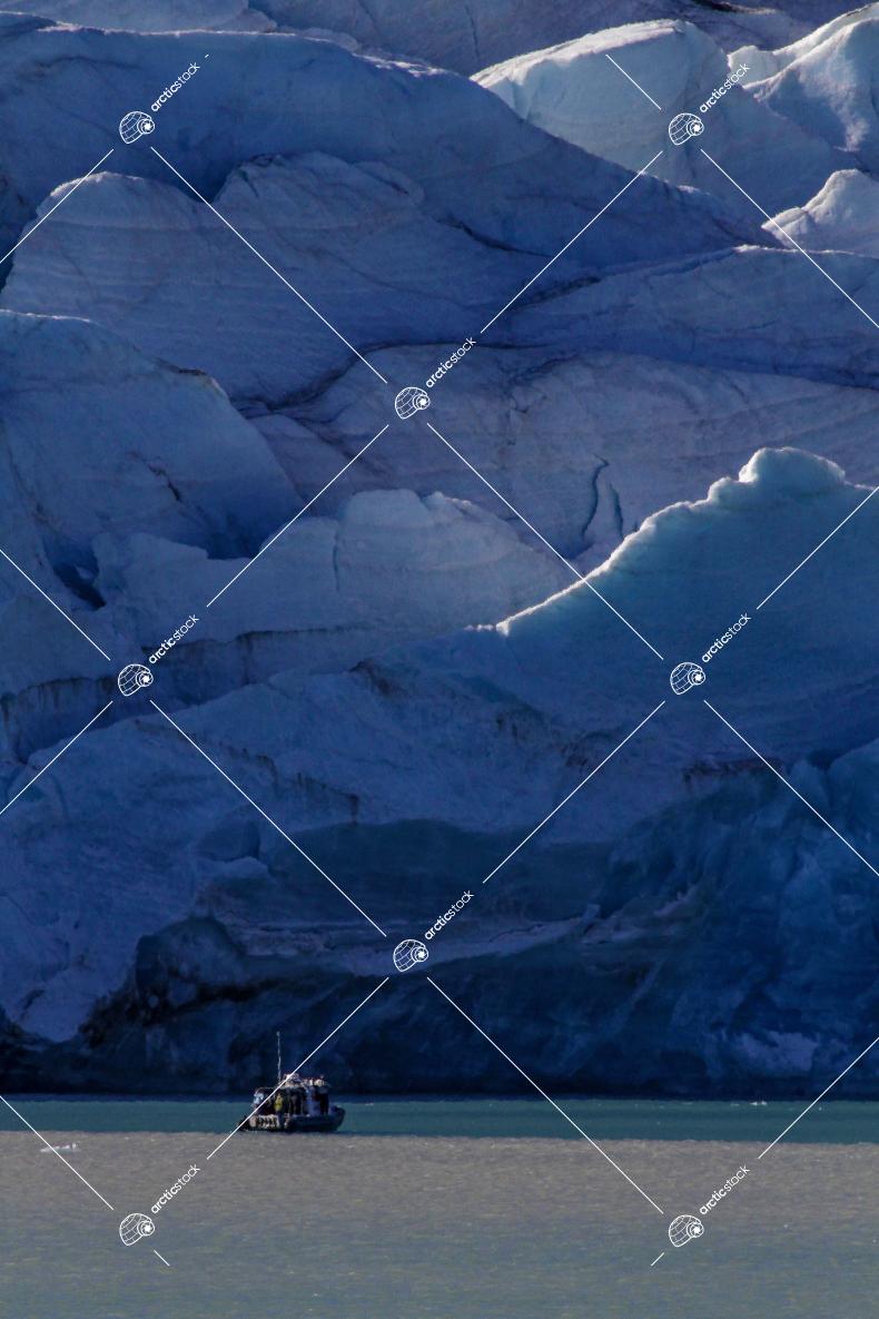 A tiny boat is facing a giant wall of ice on the south shore of Devon island.
