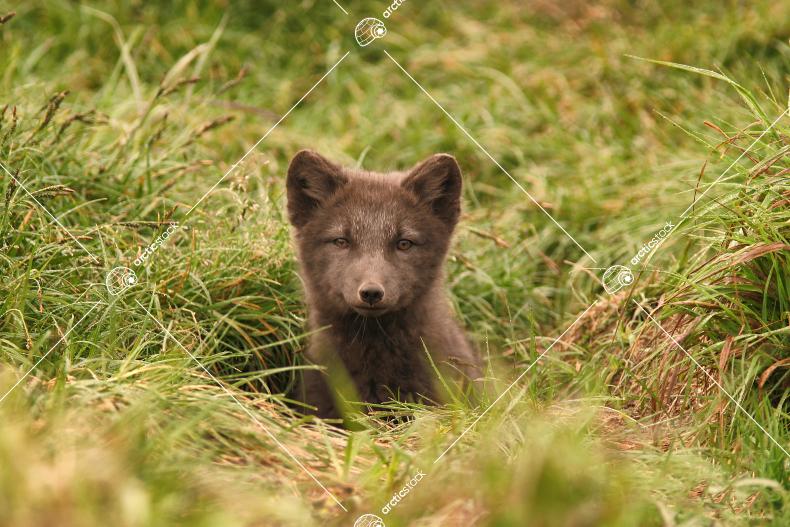 a young pup is waiting for the return of their parents with the hunt of the day. arctic fox in summer coat.